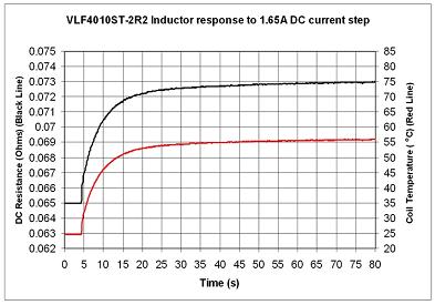 圖5中所示的測(cè)試示例在LM3554的電路中使用了VLS4010ST-2R2,直流電流階躍為1.65A。室溫時(shí)的電阻開(kāi)始時(shí)為65mΩ。超過(guò)30秒之后,電感器達(dá)到穩(wěn)態(tài),電阻變?yōu)?3mΩ,相應(yīng)的穩(wěn)態(tài)工作溫度大約為 56℃。