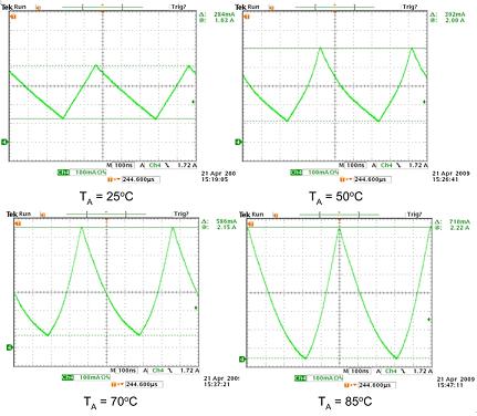 圖4左上圖顯示了在飽和點(diǎn)以下工作的電感器,具有正常的三角電流波形,可由(V/L×Δt)算出。在峰值電流保持相同且溫度升至50℃(右上圖)時(shí),電感電流斜率開(kāi)始增至1.76A標(biāo)記附近,指示顯示電感器的飽和點(diǎn)隨著溫度上升而向下移動(dòng)。當(dāng)溫度升到70℃, 然后升到85℃時(shí),隨著電感器達(dá)到飽和整個(gè)電流波形最終出現(xiàn)。