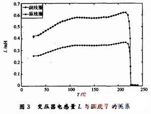 變壓器在中不僅能傳遞能量,同時還起到了電氣隔離的作用,變壓器的原邊與副邊線圈匝數(shù)比的不同可以達到升壓或降壓的作用。在模塊工作狀態(tài)下,由于磁芯的渦流效應(yīng),變壓器會產(chǎn)生很多的熱量,成為模塊熱量產(chǎn)生的主要來源。實驗中首先測試了變壓器原邊和副邊線圈的電感量隨溫度的變化,如圖3所示,從圖3中可見隨著溫度的升高,線圈的電感量先增加,然后小幅下降,再小幅上升,在環(huán)境溫度為220℃以前,變壓器的原邊與副本電感量的整體趨勢是逐漸增加,當(dāng)溫度達到220℃,磁芯溫度達到居壁點,線圈的電感量迅速降為零。對于不同磁芯材料的變壓器其居里點溫度有所不同,對于此類變壓器,可知居里溫度在220℃附近。當(dāng)變壓器溫度接近居里點時,變壓器電感量會迅速減小,會導(dǎo)致輸出電壓迅速下降。