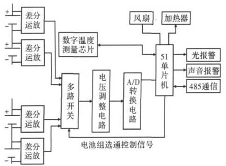 具有高電壓、高容量、循環(huán)壽命長(zhǎng)、安全性能好等優(yōu)點(diǎn)的鋰離子電池,在便攜式電子設(shè)備、電動(dòng)汽車(chē)、空間技術(shù)、國(guó)防工業(yè)等多方面具有廣闊的應(yīng)用前景。由若干節(jié)鋰離子電池經(jīng)串聯(lián)組成的動(dòng)力鋰離子電池組目前應(yīng)用最為廣泛。由于每節(jié)單體電池的電壓不一致,使用中電池不允許過(guò)充電、過(guò)放電,電池的性能和壽命受溫度影響較大等特點(diǎn),必須對(duì)串聯(lián)鋰離子電池組進(jìn)行監(jiān)測(cè),確保在使用中鋰離子電池具有良好的狀態(tài),或者使用中電池出現(xiàn)問(wèn)題立即報(bào)警,電源管理系統(tǒng)立即采取保障措施,并提醒相關(guān)人員檢修。單體電壓和電池組的溫度是辨別串聯(lián)鋰離子電池組是否正常工作的主要技術(shù)指標(biāo)。采用直接采樣法,將要測(cè)量的單體電池電壓存儲(chǔ)在非電容上進(jìn)行測(cè)量。該方法反應(yīng)時(shí)間慢、誤差較大、控制復(fù)雜; 采用運(yùn)放和光藕繼電器來(lái)測(cè)量串聯(lián)電池組的單體電壓。該方法對(duì)光耦的線(xiàn)性度要求很高,導(dǎo)致硬件成本較高。目前,直接采用集成芯片的串聯(lián)鋰離子電池組監(jiān)控系統(tǒng)受到青睞,但該方法串聯(lián)電池的數(shù)目固定,導(dǎo)致應(yīng)用不靈活、硬件成本高等缺點(diǎn)。文中研制了一種動(dòng)力鋰離子電池組監(jiān)測(cè)系統(tǒng),對(duì)串聯(lián)鋰離子電池組的單體電壓和電池組的溫度進(jìn)行在線(xiàn)監(jiān)測(cè),當(dāng)單體電池電壓偏離規(guī)定區(qū)間時(shí),監(jiān)測(cè)系統(tǒng)啟動(dòng)報(bào)警程序進(jìn)行聲、光報(bào)警; 當(dāng)電池組溫度偏離規(guī)定的區(qū)間時(shí),監(jiān)測(cè)系統(tǒng)啟動(dòng)風(fēng)扇或加熱控制電路,并存儲(chǔ)有關(guān)數(shù)據(jù),確保電池組正常工作。整個(gè)監(jiān)測(cè)系統(tǒng)具有連續(xù)測(cè)量分量、簡(jiǎn)單經(jīng)濟(jì)、精度高和可靠性高的特點(diǎn)。