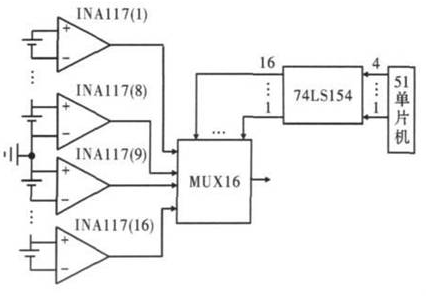 每節(jié)鋰離子電池最高電壓為5 V,由圖3 可得,第1 個(gè)INA117 的3 腳的輸入電勢(shì)最高為40 V.同理,第16 個(gè)INA117 的2 腳輸入電勢(shì)最低為- 40 V.第1 至8 個(gè)INA117 的輸出電壓為正,第9 至16 個(gè)INA117 的輸出電壓為負(fù),所以多選一模擬開(kāi)關(guān)和A/D 轉(zhuǎn)換器都要求可以輸入正、負(fù)電壓。多選一模擬開(kāi)關(guān)選用MUX16,為16 選1 可正負(fù)電壓輸入模擬開(kāi)關(guān),因此16節(jié)電池只需1 個(gè)MUX16.但由于單片機(jī)IO 口有限,文中用一片74LS154 擴(kuò)展了IO 口,僅用單片機(jī)的4 個(gè)IO 口即可控制MUX16 分別選通單節(jié)鋰離子電池進(jìn)行電壓采樣。