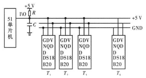 針對(duì)串聯(lián)電池組,傳統(tǒng)的測(cè)溫方法多采用模擬溫度傳感器進(jìn)行測(cè)量,在數(shù)據(jù)的采集和傳輸過(guò)程中易受外界環(huán)境的干擾,從而使測(cè)得的結(jié)果誤差較大,且當(dāng)測(cè)量點(diǎn)較多時(shí),連線(xiàn)較復(fù)雜。文中采用單片機(jī)和單總線(xiàn)數(shù)字式溫度傳感器DS18B20 來(lái)解決上述問(wèn)題。其原理如圖5 所示。
