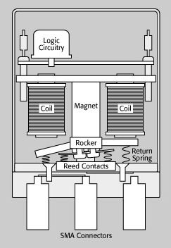 繼電器內(nèi)的容性是限制開關(guān)的信號(hào)頻率的常見因素。繼電器的材料和物理特性決定了其構(gòu)成的內(nèi)部電容。比如,在超過40GHz的射頻和微波開關(guān)中,在機(jī)電繼電器中采用了特殊的接觸架構(gòu)來獲得更好的性能。圖1顯示了一個(gè)典型的構(gòu)造,共同端接位于兩個(gè)開關(guān)端接之間。所有信號(hào)的連接線路都是同軸線,來保證最佳的信號(hào)完整性(SI)。在這種情況下,連接器是SMA母頭。對(duì)于更加復(fù)雜的開關(guān)結(jié)構(gòu),共同端接被各個(gè)開關(guān)端接以放射狀圍繞。