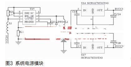 控制單元內(nèi)部單片機(jī)的供電為3.3V,其他芯片和模擬器件的供電在3V到10V之間。控制單元的電源輸入是由外部開關(guān)電源提供的。在生產(chǎn)現(xiàn)場,開關(guān)電源與水泵電機(jī)共用一路交流電,水泵在運(yùn)行過程中會引起開關(guān)電源的輸出波動,若不采取防浪涌措施勢必會影響到單片機(jī)的正常工作。根據(jù)上述分析設(shè)計系統(tǒng)電源模塊如圖3所示。電感L1起防浪涌保護(hù)作用;輸入電壓經(jīng)開關(guān)電源芯片MC34063后輸出12V電壓,然后通過兩個NCP1117ST33穩(wěn)壓芯片產(chǎn)生兩路3.3V電源分別給單片機(jī)和光電接收電路供電。