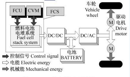(1)串聯(lián)式—下圖中采用的電力電子裝置只有電機(jī)控制器,電池和輔助動力裝置都直接并接在電機(jī)控制器的入口,屬于串聯(lián)式,車輛的驅(qū)動力只來源于電動機(jī)。