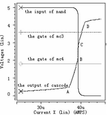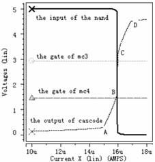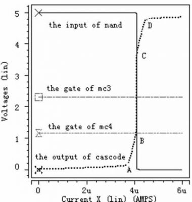 從虛線即cascode 結(jié)構(gòu)的輸出電壓波形可以看出,電流極限比較器的工作過(guò)程分為五個(gè)階段, 第一階段: 檢測(cè)電流從0 慢慢上升到A, 在此過(guò)程中, 由于檢測(cè)電流遠(yuǎn)小于極限電流, 強(qiáng)迫Mc3 和Mc4 都工作于線性區(qū)。第二階段: 檢測(cè)電流從A 上升到B, cascode結(jié)構(gòu)的輸出電壓也隨著上升, 使Mc4 工作于飽和區(qū), Mc3 工作于線性區(qū)。但是Mc4 只是剛剛進(jìn)入飽和區(qū),還受溝道調(diào)制因素影響, 這可從圖中很清析地看出當(dāng)cascode 結(jié)構(gòu)的輸出電壓隨檢測(cè)電流上升時(shí), Mc4 中電流慢慢接近所設(shè)定的極限電流。第三階段: 檢測(cè)電流從B 上升到C, 此時(shí)檢測(cè)電流已上升到所設(shè)定的極限電流, Mc3 和Mc4 都工作于飽和區(qū), 同時(shí)cascode 結(jié)構(gòu)的輸出電壓也上升到后面反相器的中點(diǎn)電壓, 經(jīng)過(guò)后續(xù)控制電路關(guān)斷功率管。第四階段:檢測(cè)電流從C 上升到D, 此時(shí)檢測(cè)電流大于所設(shè)定的極限電流, 迫使Mc5 工作于線性區(qū), 雖Mc6 還工作于飽和區(qū),但受溝道調(diào)制因素影響, 另外Mc3 和Mc4 工作于飽和區(qū)。第五階段: 檢測(cè)電流從D 繼續(xù)往上升, 迫使Mc5 和Mc6 都工作于線性區(qū),Mc3 和Mc4 工作于飽和區(qū)。從圖4 中可以看出, 當(dāng)檢測(cè)電流達(dá)到4.1μA 時(shí), 關(guān)斷功率管,滿足系統(tǒng)要求。圖5- - 圖7 的工作情況與圖4 類(lèi)似, 圖5 設(shè)定極限電流為16μA, 可以看出當(dāng)檢測(cè)電流達(dá)到15.97μA 時(shí),關(guān)斷功率管。圖6 設(shè)定極限電流為24μA, 可以看出當(dāng)檢測(cè)電流達(dá)到23.82μA 時(shí), 關(guān)斷功率管。圖7 設(shè)定極限電流為40μA, 可以看出當(dāng)檢測(cè)電流達(dá)到39.6μA 時(shí), 關(guān)斷功率管。