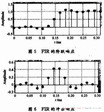 點擊“design filter”即可。值得注意的是,這里選擇filter order為15階,而不是所設計的16階濾波器。因為常數(shù)系數(shù)項h(0)=0。通過菜單“analysis”選擇“magnitude”和“phase response”即可得到圖3,圖4的特性顯示。“analysis”選擇“step response”和“im-pulse”可以得到圖5,圖6的響應顯示??梢钥闯鏊O計FIR濾波器的階躍響應和沖擊響應比較接近理想狀態(tài)。