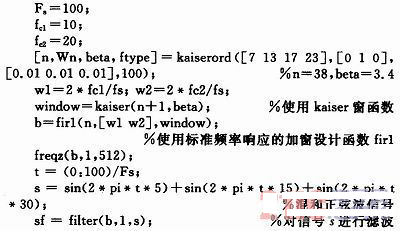 Matlab信號處理工具箱提供了各種窗函數(shù)、濾波器設計函數(shù)和濾波器實現(xiàn)函數(shù)。設計中利用Matlab提供的函數(shù)firl來實現(xiàn),編程則是直接調(diào)用這些函數(shù)簡單直觀的完成設計。調(diào)用格式:firl(n,Wn,‘ftype’,Window),其中n為階數(shù)、Wn為截止頻率、ftype是濾波器的類型、Window是窗函數(shù)。應用凱塞窗的代碼如下: