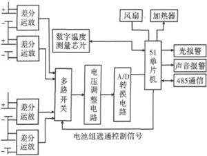 具有高電壓、高容量、循環(huán)壽命長(zhǎng)、安全性能好等優(yōu)點(diǎn)的鋰離子電池,在便攜式電子設(shè)備、電動(dòng)汽車、空間技術(shù)、國(guó)防工業(yè)等多方面具有廣闊的應(yīng)用前景。由若干節(jié)鋰離子電池經(jīng)串聯(lián)組成的動(dòng)力鋰離子電池組目前應(yīng)用最為廣泛。由于每節(jié)單體電池的電壓不一致,使用中電池不允許過(guò)充電、過(guò)放電,電池的性能和壽命受溫度影響較大等特點(diǎn),必須對(duì)串聯(lián)鋰離子電池組進(jìn)行監(jiān)測(cè),確保在使用中鋰離子電池具有良好的狀態(tài),或者使用中電池出現(xiàn)問(wèn)題立即報(bào)警,電源管理系統(tǒng)立即采取保障措施,并提醒相關(guān)人員檢修。單體電壓和電池組的溫度是辨別串聯(lián)鋰離子電池組是否正常工作的主要技術(shù)指標(biāo)。文獻(xiàn)[1]采用直接采樣法,將要測(cè)量的單體電池電壓存儲(chǔ)在非電容上進(jìn)行測(cè)量。該方法反應(yīng)時(shí)間慢、誤差較大、控制復(fù)雜;文獻(xiàn)[2]采用運(yùn)放和光藕繼電器來(lái)測(cè)量串聯(lián)電池組的單體電壓。該方法對(duì)光耦的線性度要求很高,導(dǎo)致硬件成本較高。目前,直接采用集成芯片的串聯(lián)鋰離子電池組監(jiān)控系統(tǒng)受到青睞,但該方法串聯(lián)電池的數(shù)目固定,導(dǎo)致應(yīng)用不靈活、硬件成本高等缺點(diǎn)。文中研制了一種動(dòng)力鋰離子電池組監(jiān)測(cè)系統(tǒng),對(duì)串聯(lián)鋰離子電池組的單體電壓和電池組的溫度進(jìn)行在線監(jiān)測(cè),當(dāng)單體電池電壓偏離規(guī)定區(qū)間時(shí),監(jiān)測(cè)系統(tǒng)啟動(dòng)報(bào)警程序進(jìn)行聲、光報(bào)警;當(dāng)電池組溫度偏離規(guī)定的區(qū)間時(shí),監(jiān)測(cè)系統(tǒng)啟動(dòng)風(fēng)扇或加熱控制電路,并存儲(chǔ)有關(guān)數(shù)據(jù),確保電池組正常工作。整個(gè)監(jiān)測(cè)系統(tǒng)具有連續(xù)測(cè)量分量、簡(jiǎn)單經(jīng)濟(jì)、精度高和可靠性高的特點(diǎn)。