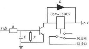 電路如圖6所示,F(xiàn)AN為低電平時(shí),晶體管9014不導(dǎo)通,此時(shí)繼電器無(wú)動(dòng)作;當(dāng)FAN為高電平時(shí),晶體管9014導(dǎo)通,使得繼電器觸點(diǎn)吸合,風(fēng)扇在24V電源電壓的供電下開始工作。