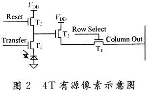 轉(zhuǎn)移管T1被用來將光敏二極管連接至源跟隨器T3,并通過復位管T2與VDD相連。T3的柵極與T1和T2之間的N+擴散區(qū)相連。與3T結(jié)構(gòu)的APS相比,減少了與T3的柵極相關(guān)的漏電流效應。源跟隨器T3的作用是實現(xiàn)對信號的放大和緩沖,改善APS的噪聲問題。T4是用來將信號與列總線相連。其工作過程是:首先進入“復位狀態(tài)”,T2打開,對光敏二極管復位;然后進入“取樣狀態(tài)”,T2關(guān)閉,光照射到光敏二極管上產(chǎn)生光生載流子,并通過源跟隨器T3放大輸出;最后進入“讀出狀態(tài)”,這時行選通管T4打開,信號通過列總線輸出。