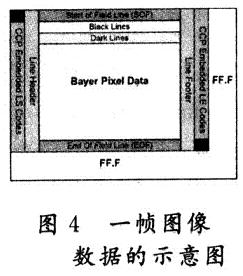由APS陣列所獲得的圖像信息,經(jīng)過圖1中列模數(shù)轉(zhuǎn)換器(Column ADC)轉(zhuǎn)換為數(shù)字信號后,再經(jīng)過一系列的后續(xù)處理過程,得到輸出如圖4所示的幀圖像數(shù)據(jù)結(jié)構(gòu)。