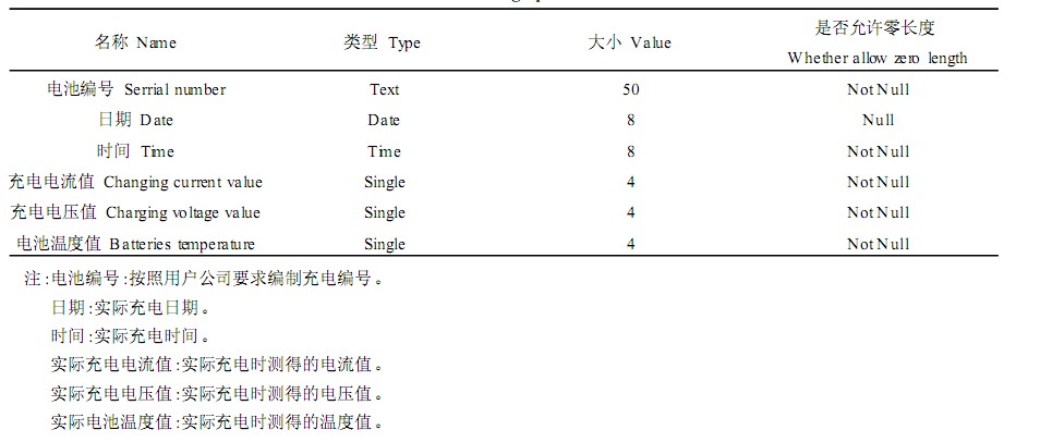 本系統(tǒng)設(shè)計了三個數(shù)據(jù)庫,用于標(biāo)準(zhǔn)充電曲線存儲、實際充電曲線存儲及分析結(jié)果存儲。使用VB6. 0提供的數(shù)據(jù)庫管理工具"可視化數(shù)據(jù)管理器"建立。其中實際充電曲線數(shù)據(jù)表如表1所示,數(shù)據(jù)庫的建立方便了對電池的查詢、分析,同時也方便了管理。