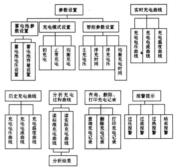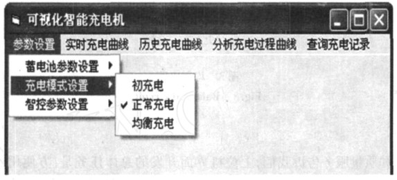在參數(shù)設(shè)置中可以對框圖中所示的條目進行設(shè)置,使得該系統(tǒng)具有很強的通用性。電動車電池一般由幾個單體組合而成,可以選擇單體個數(shù)以確定電池組的電壓和容量。該系統(tǒng)提供了如框圖所示的三種充電模式,一般新電池前五次充電要進行初充電以充分激活電解質(zhì),當(dāng)單體電量不同時要均衡充電,其余時正常充電。還可以按照需求設(shè)置不同充電階段的充電時間,來滿足各種電池的不同需求;實時充電曲線實時地顯示充電電流、電壓和電池溫度;歷史充電曲線可以顯示該電池組充電歷史;通過分析充電過程曲線即可了解電池存在的問題,如:蓄電池缺乏電解液、電解液比重不符合要求或蓄電池單體存在差異等,從而及時的對電池進行保養(yǎng);該系統(tǒng)還提供了按日期或電池編號查詢、刪除充電記錄的數(shù)據(jù)庫功能,方便了操作;報警提示用來告知用戶充電的過壓、過流、過熱情況以及充電是否結(jié)束。