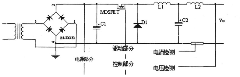 在主充電路中, 220 V電壓經(jīng)變壓器降壓后,由整流器整流和大電容C1 平滑濾波,作為直流充電電源。MOSFET、二極管D1、電感L1 和電容C2 構(gòu)成主充電路。在工作過程中, PWM控制信號的高電平脈沖出現(xiàn),使MOSFET導(dǎo)通之后,電感L1 的電流不斷增大,電容C2 充電,主充變換器不斷存儲能量,同時通過電感L2 對電池充電,此時,續(xù)流二極管因反向偏置而截止。經(jīng)過PWM高電平脈沖持續(xù)時間后, PWM信號變低,MOSFET截止,電感L1 中的電流減小, L1 兩端的感應(yīng)電動勢使續(xù)流二極管導(dǎo)通, L1 中的存儲電流和電容C2 存儲電荷向電池充電。經(jīng)過PWM信號的低電平持續(xù)時間后, PWM信號的又一高電平脈沖到來,再度使MOSFET導(dǎo)通,上述過程循環(huán)交替。電感L2 的作用是平滑充電電流.