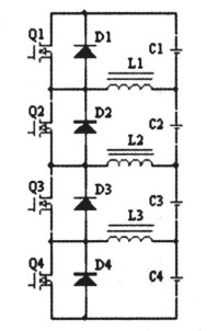 在均衡電路中,以4節(jié)電池為例,當(dāng)對第二節(jié)電池均衡時,開啟MOS管Q2,蓄電池C2通過Q2給電感L1、L2充電,然后關(guān)斷MOS管Q2,則電感L1中的電流通過二極管D1回饋給蓄電池C1,電感L2中的電流通過二極管D3和D4回饋給蓄電池C3和C4,以達到各個單體均衡的效果。