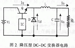 圖2所示為降壓型DC-DC變換器的典型電路,當(dāng)控制器IC感應(yīng)到輸出電壓Vo太低時,啟動通道上的晶體管Q給電感器L充電,同時也對電容器C充電,當(dāng)輸出電壓V0上升到一個預(yù)定值時,控制器關(guān)閉通道上的晶體管Q,電感器L和電容器C上獲取的能量通過肖特基二極管構(gòu)成的回路自由釋放,從電感器L到電容器C進行有效的能量傳輸會消耗一部分能量,因此加載在負(fù)載上的電壓有所下降。