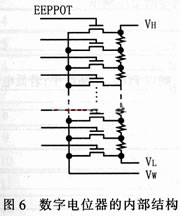 數(shù)字電位器的內(nèi)部結(jié)構(gòu)如圖6所示,它用控制MSO管的開關(guān)來調(diào)節(jié)滑動端VW在VH和VL之間多個等值電阻的位置,抽頭數(shù)越多,等值電阻越多。調(diào)整的范圍越寬,對DC-DC變換器的輸出電壓調(diào)整幅度越小。