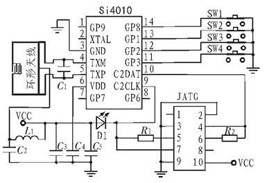 無線電發(fā)射系統(tǒng)是以Si4010 為核心來設(shè)計。Si4010 的4 個輸入輸出端口與按鍵直接相連,內(nèi)部電路可直接采集按鍵狀態(tài)信息。Si4010 的信號差分輸出端TXM、TXP 分別與環(huán)形天線的兩端連接,環(huán)形天線直接印制在PCB 板上,減少了發(fā)射系統(tǒng)體積。采用C2 接口編程,Si4010 的C2DATA、C2CLK 端口與JTAG 接口的4 個端口相連。C3、C4、C5組成電源濾波電路。發(fā)光二極管提供按鍵動作指示,當有按鍵按下時,放光二極管亮,沒有按鍵按下,放光二極管滅。無線電發(fā)射系統(tǒng)的主要功能是在Si4010 內(nèi)部MCU的控制下采集按鍵電路的狀態(tài)信息, 實現(xiàn)數(shù)據(jù)加密和編碼,再進行FSK 調(diào)制,調(diào)制后信號經(jīng)放大調(diào)諧,由環(huán)形天線發(fā)射出去。