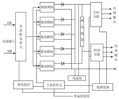 智能高頻開關電源系統(tǒng)的總體結構主要由主監(jiān)控單元、配電模塊、交流配電單元、整流模塊等組成, 系統(tǒng)總體的結構圖如圖1 所示。系統(tǒng)中的各個監(jiān)控單元受主監(jiān)控單元的管理和控制,通過通信線將各個監(jiān)控單元采集的信息送給主監(jiān)控統(tǒng)一管理。主監(jiān)控顯示直流系統(tǒng)各種信息,用戶也可以觸摸顯示屏查詢信息及操作,系統(tǒng)信息還可以接入到遠程監(jiān)控系統(tǒng)中。系統(tǒng)除了交流監(jiān)控、直流監(jiān)控、開關量監(jiān)控等基礎單位外,還配置了絕緣監(jiān)測、降壓裝置、電池巡檢等功能單元,以達到對直流系統(tǒng)進行全面監(jiān)控的目的。