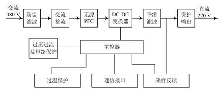本文設計的整流模塊的工作原理框圖如圖2 所示,工作時, 模塊首先通過過防雷處理和濾波對輸入的三相交流進行處理,這樣才能保證模塊后級電路的安全; 經過處理后的三相交流經過整流和無源PFC 后轉換成高壓直流時,這時轉換的高壓直流要經過DC/DC變換器再次轉換成可變的直流電壓輸出; 另外模塊控制部分還有負責過壓、過流以及短路保護等作用,這樣才能保證輸出電壓的穩(wěn)定, 也同時能對模塊各部件進行保護。模塊還在遠程監(jiān)控中提供了 四遙 (遙控、遙調、遙測、遙信) 接口。[page]