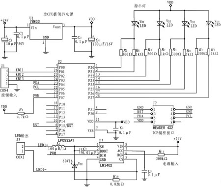 P89LPC932是由飛利浦生產(chǎn)的低功耗單片微處理器,電源電壓3.3V,可低功耗運行,適合于許多要求高集成度、低成本的場合??梢詽M足多方面的性能要求。P89LPC932采用了高性能的處理器結(jié)構(gòu),指令執(zhí)行時間只需2~4個時鐘周期,6倍于標準80C51器件。P89LPC932集成了許多系統(tǒng)級的功能,這樣可大大減少元件的數(shù)目、電路板的面積以及系統(tǒng)的成本,其內(nèi)部有2個定時器,可作為一個具有256個定時器時鐘周期的PWM發(fā)生器使用。LED調(diào)光電路電氣原理圖如圖2所示。
