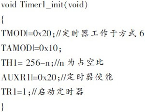 微處理器P89LPC932內(nèi)部定時器TO/T1的PWM輸出與計數(shù)輸入和定時器觸發(fā)輸出占用相同的管腳,發(fā)生定時器溢出時自動觸發(fā)端口輸出。此功能通過AUXR1寄存器中的控制位ENT0和ENT1分別使能定時器0和1。該模式打開時,在首次定時器溢出前端口的輸出為邏輯1。為了使該模式生效,必須清零C/T位以選擇PCLK作為定時器的時鐘源。定時器初始化設(shè)置參考程序如下:
