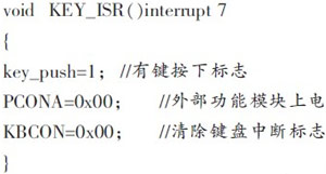 經(jīng)檢測,在同等照度要求的情況下,采用LED調(diào)光控制系統(tǒng)的功耗較白熾燈降低90%以上,當然為進一步降低能耗,節(jié)能方法的探究仍然具有十分重要的意義。在多數(shù)時間,HBLEDs可能處于熄滅狀態(tài),若控制系統(tǒng)處于待機狀態(tài)或掉電狀態(tài),可將功耗降低到最低;或?qū)FF端口接地,也可將LM3402置于一個極低的低功率關(guān)機狀態(tài)。將微處理器P89LPC932的電源控制寄存器PCONA設(shè)置為0xFF時,外部功能模塊掉電;將電源控制寄存器PCON設(shè)置為03H時,可將微處理器處于完全掉電狀態(tài),只有在中斷觸發(fā)的時候,才能喚醒,隨即給外部功能模塊上電,微處理器開始工作。微處理器主要通過鍵盤中斷喚醒,鍵盤中斷參考程序如下: