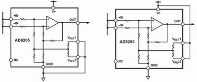 雙極性輸出時(shí)AD8205可以測(cè)量流過采樣電阻上的雙向電流,這時(shí),輸出可以偏置到輸出范圍內(nèi)的任意位置。當(dāng)被檢測(cè)的正反兩個(gè)方向上的電流為等幅時(shí),其輸出必須偏置到滿量程輸出的中間位置。當(dāng)雙向電流幅值不對(duì)稱時(shí),輸出偏置可以對(duì)應(yīng)地偏離半量程位置。它的兩個(gè)參考輸入VREF1和VREF2分別連接一個(gè)內(nèi)部電阻RREF后接到同一個(gè)內(nèi)部偏置節(jié)點(diǎn),這兩個(gè)參考輸入端的操作方式完全相同。在兩個(gè)參考電壓輸入端接入對(duì)應(yīng)的電壓,即可完成對(duì)輸出的偏置。在雙極性輸出方式下,一般有以下兩種連接方式。