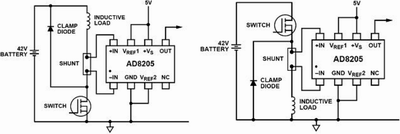 如圖4(b)所示連接,PWM開關(guān)和采樣電阻都位于電壓高側(cè)。當(dāng)PWM開關(guān)打開時(shí),負(fù)載電源將被移除,但仍然可以提供和監(jiān)測(cè)續(xù)流電流,以實(shí)現(xiàn)電流控制診斷。在工作過程中,大部分時(shí)間電源都和負(fù)載隔離,這樣可將負(fù)載對(duì)地之間的差分電壓所引起的不良影響減到最小。當(dāng)PWM開關(guān)閉合時(shí),電源電壓將連接到負(fù)載,這時(shí)共模電壓將增加到電源電壓。而PWM開關(guān)打開時(shí),電壓將反轉(zhuǎn)并經(jīng)過感性負(fù)載,由于續(xù)流二極管的作用,使得采樣電阻上的共模電壓保持為一個(gè)低于地的二極管的導(dǎo)通壓降。