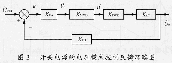 KFB=UREF/Uo,為反饋系數(shù);誤差e為輸出采樣值偏離穩(wěn)態(tài)點的波動值,經(jīng)電壓誤差放大器KEA放大后,得;KMOD為脈沖寬度調(diào)制器增益,KMOD=d/=1/Vs;KPWR為主電路增益,KPWR=/d=Uin;KLC為輸出濾波器傳遞函數(shù),KLC=(1 sCRe)/[S2LC s(ReC L/Ro) 1]。