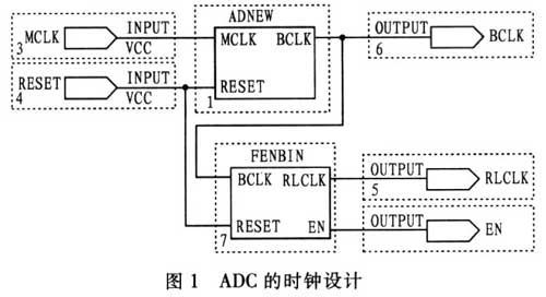 圖1示出A/D轉(zhuǎn)換器的輸入時鐘設(shè)計,MD轉(zhuǎn)換器工作在從模式下時,需要外部提供RLCLK和BCLK。在主時鐘MCLK的輸入下,通過對MCLK 4分頻得到BCLK的信號,用來作為位數(shù)據(jù)提取的信號。RLCLK是通過對BCLK的32分頻得到的,用來區(qū)分左右通道的數(shù)據(jù),同時輸出EN信號作為后續(xù)處理的同步信號。