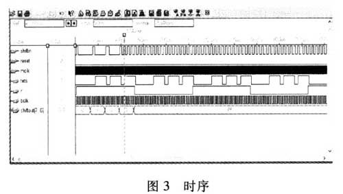 筆者用MaxPlus II對以上設(shè)計進行仿真后得到圖3所示的時序圖,完全滿足設(shè)計要求,從圖3可以看出串行輸入的數(shù)據(jù)(shiflin)變成并行的數(shù)據(jù)(shiftout) 輸出,在此過程中數(shù)據(jù)延時8個周期,每個txts的上升沿提取數(shù)據(jù)能保證數(shù)據(jù)的正確性。因為從數(shù)據(jù)的變動到txts的上升沿有400ns,大于FPGA的數(shù)據(jù)建立時間(25ns~50ns),可以保證提取數(shù)據(jù)的正確性。