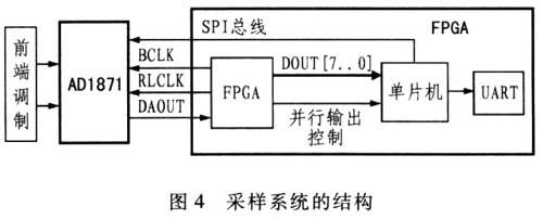 圖4示出采用ADl871構(gòu)成的采樣系統(tǒng)結(jié)構(gòu)。整個系統(tǒng)在1個FPGA上實現(xiàn),分為3部分:并轉(zhuǎn)換模塊;ADC控制和配置;UART通信。