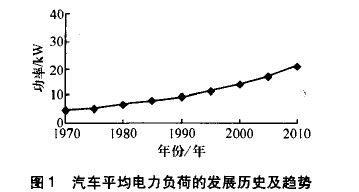 汽車電源的電壓從上世紀50年代的6V改為12V,己有50多年的歷史。自1990年開始,汽車用電量每年以5%~8%的比例增加,其平均電力負荷的發(fā)展歷史與趨勢見圖1。隨著汽車技術的不斷進步,將會有越來越多的電氣及電子系統(tǒng)被應用到汽車上。