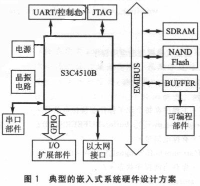 圖1是一種典型的嵌入式系統(tǒng)硬件設(shè)計(jì)方案。系統(tǒng)的微處理器采用S3c4510B,是基于ARM7體系結(jié)構(gòu)的。SDRAM是一種易失性存儲(chǔ)器作為程序的運(yùn)行空間,類似于PC機(jī)的內(nèi)存;Flash作為程序存儲(chǔ)空間是非易失性的。程序運(yùn)行過程中的數(shù)據(jù)往往緩存在sDRAM中,在系統(tǒng)失電時(shí)必須寫往Flash。