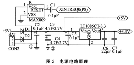 這個(gè)電源回路除了可以提供5v和3.3v的電源以外,還為系統(tǒng)掉電保護(hù)提供了延時(shí)及預(yù)警功能,通過軟件的配合可以實(shí)現(xiàn)系統(tǒng)的掉電保護(hù)機(jī)制。正常情況下,由供電回路1給整個(gè)系統(tǒng)供電。當(dāng)系統(tǒng)由于意外原因掉電時(shí),由于輸入的比較電壓降低,這樣MAX809 模塊輸出電壓產(chǎn)生翻轉(zhuǎn)為系統(tǒng)提供掉電中斷預(yù)警信號(hào),中斷請(qǐng)求通過外部中斷引腳XREQ0產(chǎn)生;同時(shí)供電回路2開始啟用。通過大電容C3、c4放電,繼續(xù)為系統(tǒng)提供一段供電電壓,支持掉電中斷服務(wù)程序完成。供電回路2只給最小系統(tǒng)供電,并不給耗電量大的外圍部件供電。這樣,給最小系統(tǒng)的供電時(shí)間足夠長(zhǎng),可以完成敏感數(shù)據(jù)的保護(hù)操作。