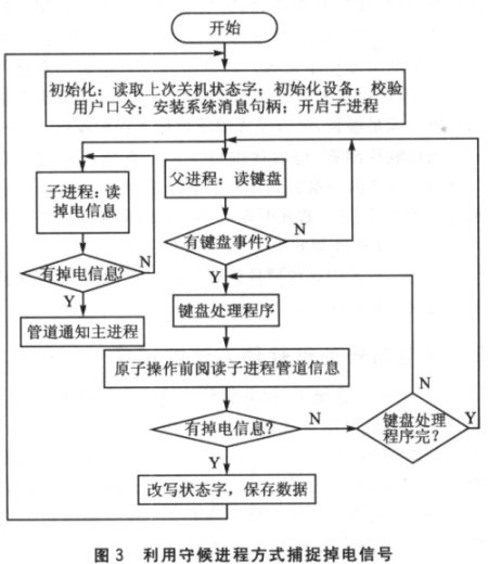 另一種方式是采用守候進(jìn)程的方式,開通一個(gè)進(jìn)程,此進(jìn)程專門等待中斷信號(hào)。主程序根據(jù)數(shù)據(jù)操作對(duì)象的不同,將自己的流程方案劃分成若干原子操作,所謂原子操作即劃定的程序塊要么完全執(zhí)行,要么不執(zhí)行。每個(gè)操作對(duì)應(yīng)惟一狀態(tài)標(biāo)志。在每個(gè)原子操作前,主進(jìn)程都將會(huì)通過管道通信的方式閱讀中斷信號(hào)。如果中斷信號(hào)產(chǎn)生,主進(jìn)程首先保存狀態(tài)標(biāo)志,然后將相關(guān)數(shù)據(jù)寫往Flash后退出,電源恢復(fù)后,主進(jìn)程首先根據(jù)標(biāo)志字確定系統(tǒng)恢復(fù)方案。圖3用流程圖的方式實(shí)現(xiàn)這一過程。