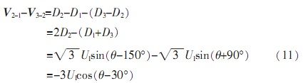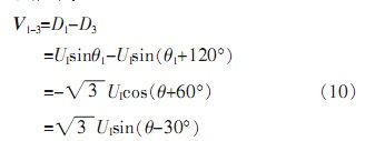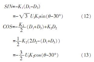 由于自整角機(jī)中定子繞組為星型連接,彼此在空間上呈120°,并且輸出三路定子繞組電壓D1、D2、D3是相對于中心點而言,無法對其單獨處理。由公式(5)可知,其任意兩線間電壓為: