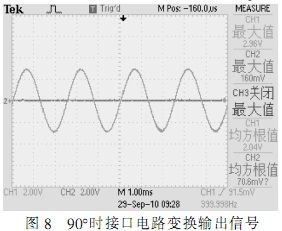 根據(jù)圖中所示,在確定的角度下,自整角機(jī)三路線線信號在電壓上呈120°正弦關(guān)系,接口電路轉(zhuǎn)換輸出信號為兩路電壓正交信號,根據(jù)角度不同,兩路信號電壓峰值不同,單路最大時電壓為2Vrms。測試結(jié)果完全符合設(shè)計要求。