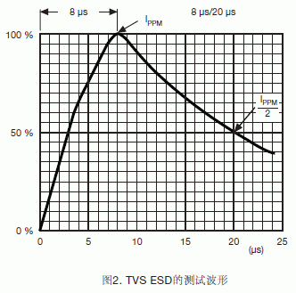 TVS的額定功率是在一定測試或應用條件下吸收浪涌的能力。10μs/1000μs脈沖波形的工業(yè)標準測試條件(Bellcore 1089標準)如圖1所示。這個測試條件不同于8μs/20μs脈沖波形的TVS瞬態(tài)電壓吸收能力測試條件,如圖2所示。