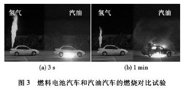 邁阿密大學(xué)的 MICHAEL[15]分別對(duì)燃料電池汽車和汽油汽車的燃燒進(jìn)行對(duì)比試驗(yàn),將兩輛汽車分別用氫氣和汽油做燃料,然后做泄漏點(diǎn)火試驗(yàn),如圖 3 所示。點(diǎn)火 3 s 后,高壓氫氣產(chǎn)生的火焰直噴上方,而汽油由于比空氣重,則從汽車的下部著火。到 1 min 時(shí),氫氣作燃料的汽車只有漏出的氫氣在燃燒,汽車沒(méi)有大問(wèn)題; 而汽油車則早已成為一個(gè)大火球,完全燒光。這說(shuō)明氫氣汽車比現(xiàn)在普遍使用的汽油車安全得多。