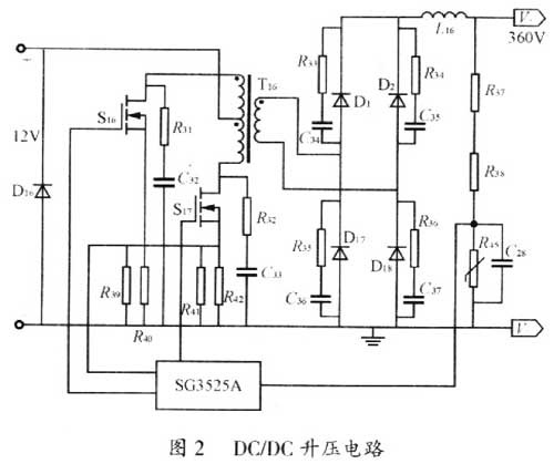 其工作原理為將升壓變壓器的中心抽頭接于正電源,兩路相反的PWM驅(qū)動脈沖送至開關(guān)管S16、S17的基極,從而控制兩只功率管交替工作,得到的方波交流電壓經(jīng)變壓器輸出,經(jīng)電感L16和電容濾波得到360V直流。電流檢測電阻(R41//R42)得到的電壓接到SG3525A的腳10來實現(xiàn)過流保護。R37、R38和R45為電壓采樣,構(gòu)成電壓負(fù)反饋,因而提高了電路的可靠性。SG3525A及控制電路的電源都來自蓄電池,D16為防反接二極管。DC/DC從12V蓄電池電壓升到360V直流電,供后級鎮(zhèn)流電路點燈。