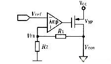 間接閉環(huán)控制環(huán)路如圖1所示,該控制環(huán)路包括一個誤差放大器,反饋環(huán)路和調(diào)整管(VMP管)。工作原理是由誤差放大器將輸出反饋電壓VFB與參考電壓Vref進(jìn)行比較,并放大其差值(Vref-VFB)以此來控制調(diào)整管(VMP)的導(dǎo)通狀態(tài),實(shí)現(xiàn)負(fù)反饋,從而得到穩(wěn)定的輸出Vcon。電路剛啟動時,反饋電壓VFB很低,如果穩(wěn)壓器啟動時產(chǎn)生較大的電容(或者負(fù)載電容很大)或VMP管導(dǎo)通時有較小的電阻,浪涌電流(即流過VMP管的瞬間電流)就會很大,有時會接近穩(wěn)壓器的電流限值。因此,必須在誤差放大器中設(shè)計(jì)軟啟動電路,以保證整個電路在上電后進(jìn)入正常的直流偏置狀態(tài),不會產(chǎn)生浪涌電流。