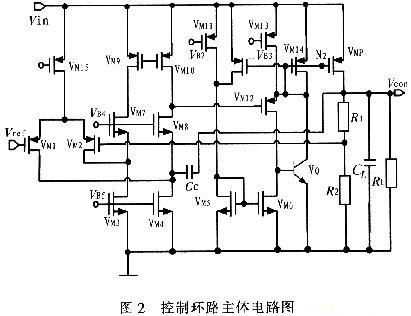 閉環(huán)控制系統(tǒng)的主體電路如圖2所示,VM1~VM8組成折疊式的誤差放大器,VM9~VM10組成單級的電流鏡作為負(fù)載,這樣做的好處就是采用10 pF左右的補(bǔ)償電容就可以使系統(tǒng)達(dá)到穩(wěn)定。VM5~VM14和VQ組成級間緩沖級。R1和R2組成反饋網(wǎng)絡(luò),其中