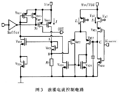 由上面分析可知,由于N2節(jié)點(diǎn)電壓迅速變化,導(dǎo)致大的浪涌電流流過P功率管(VMP管)。因此只需要控制N2節(jié)點(diǎn)電壓的變化就可以實(shí)現(xiàn)電流的控制,控制該浪涌電流變化無非就是控制其變化的斜率和峰值。其具體的電路原理圖包括兩個部分,即浪涌電流的斜率控制部分和峰值控制部分。具體的實(shí)現(xiàn)電路如圖3所示。