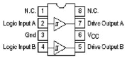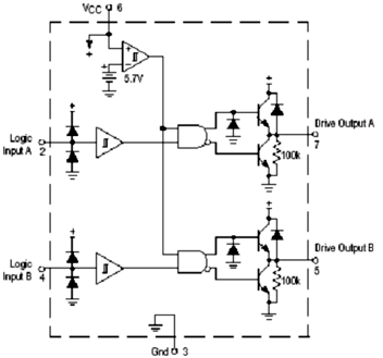 MC34152的外圍電路簡單,應用方便。它是8管腳的同相推挽驅動芯片,具體的內部結構和封裝如圖4所示。2,4腳為兩路控制信號輸入,經(jīng)過芯片內部的推挽放大,直接輸出同相的兩路驅動信號(7,5腳)。為使芯片更加穩(wěn)定地工作,一般在芯片的電源端并聯(lián)一個濾去高頻干擾的瓷片電容和一個濾去低頻干擾的電解電容。