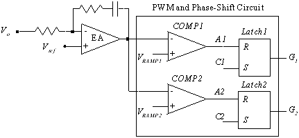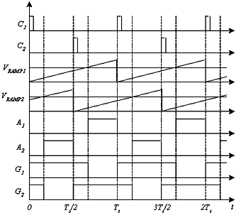 如圖3所示,時鐘信號C1和C2相差180度,它們分別對應的鋸 VRAMP1 和 VRAMP2 也相差180度,電壓誤差放大器的輸出信號 VEA、Vo 分別與 VRAMP1 和 VRAMP2 相比較,再通過兩個RS觸發(fā)器得到相差180度的驅動信號 G1 和 G2 。