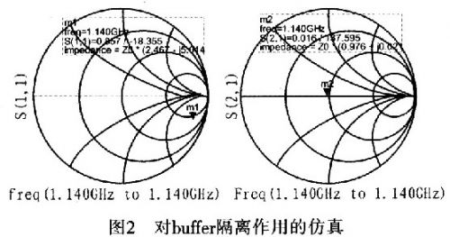 圖2是對(duì)buffer隔離作用的仿真。通過(guò)仿真發(fā)現(xiàn):壓控振蕩器與外部電路相接時(shí),外部電路阻抗的變化不會(huì)對(duì)壓控振蕩器的阻抗產(chǎn)生影響。