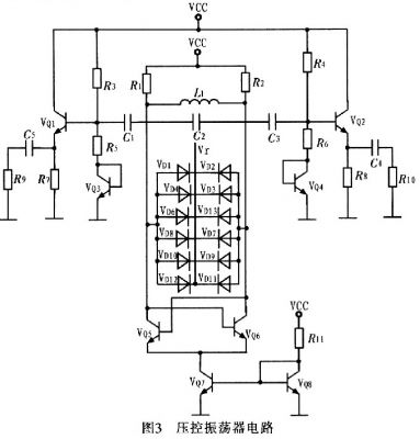 壓控振蕩器按構(gòu)成原理可分為反饋型振蕩器和負(fù)阻型振蕩器2大類(lèi)。這里采用負(fù)阻型振蕩器,其主要是由負(fù)阻器件和諧振回路組成的振蕩器,利用負(fù)阻器件的負(fù)電阻效應(yīng)與諧振回路中的損耗正電阻相抵消,維持諧振回路的穩(wěn)定振蕩。圖3為壓控振蕩器電路。